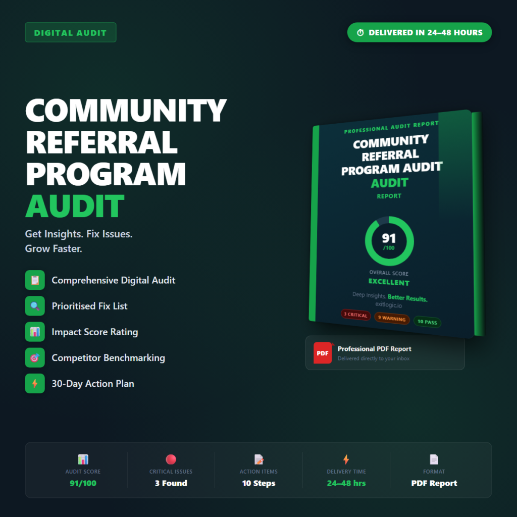 Your Community Referral Program Audit surfaces the specific issues costing you revenue, users, or rankings in this areaβ¦