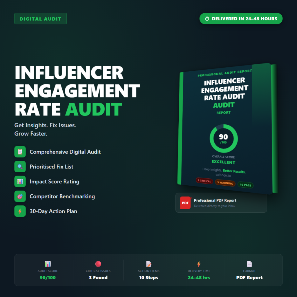 Your Influencer Engagement Rate Audit surfaces the specific issues costing you revenue, users, or rankings in this area…