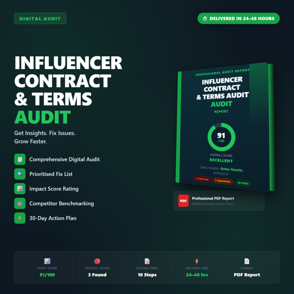 Your Influencer Contract & Terms Audit surfaces the specific issues costing you revenue, users, or rankings in this…