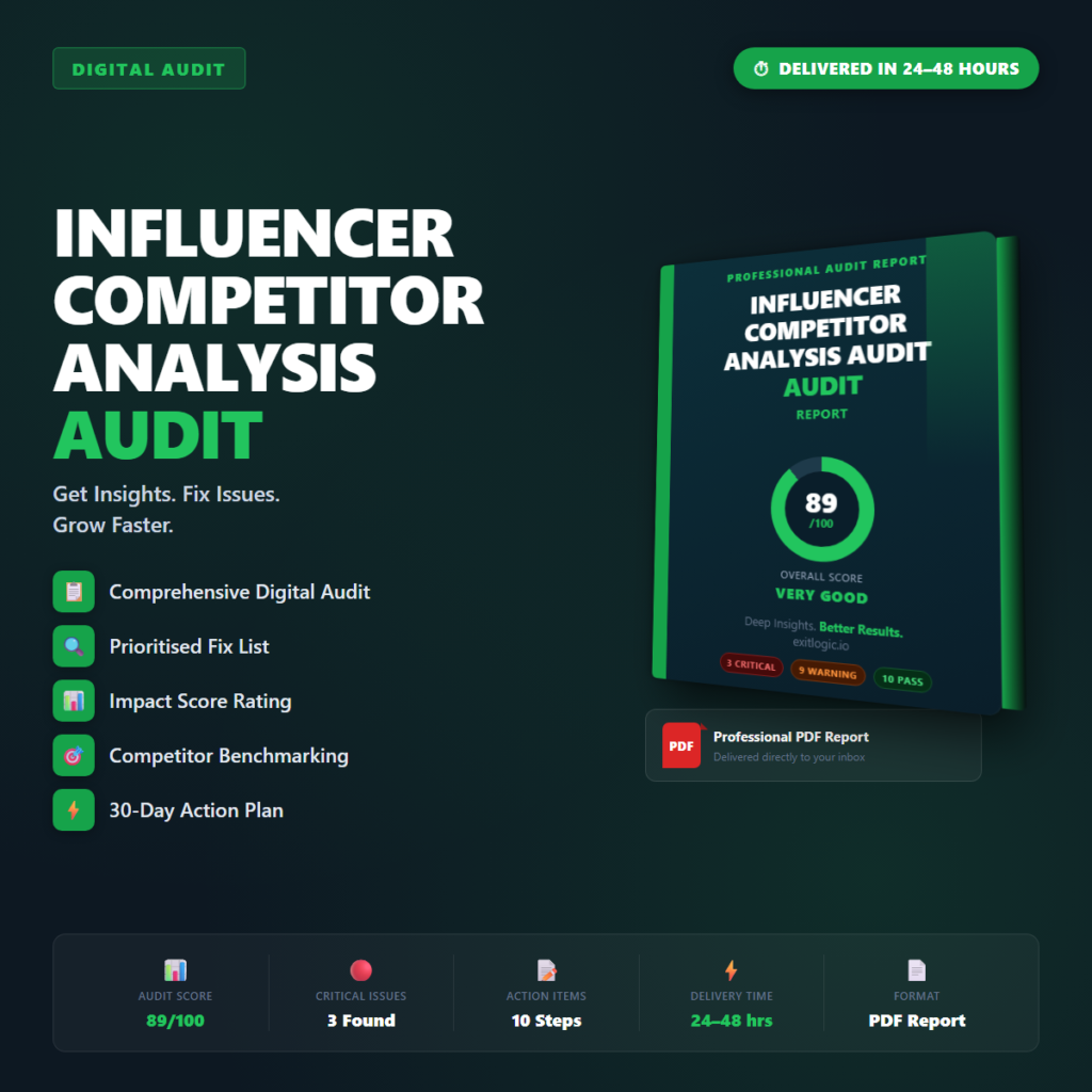 Your Influencer Competitor Analysis Audit surfaces the specific issues costing you revenue, users, or rankings in this area…