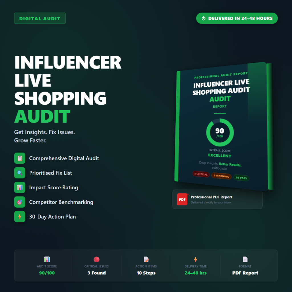 Your Influencer Live Shopping Audit surfaces the specific issues costing you revenue, users, or rankings in this area…