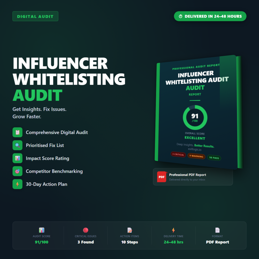 Your Influencer Whitelisting Audit surfaces the specific issues costing you revenue, users, or rankings in this area —…