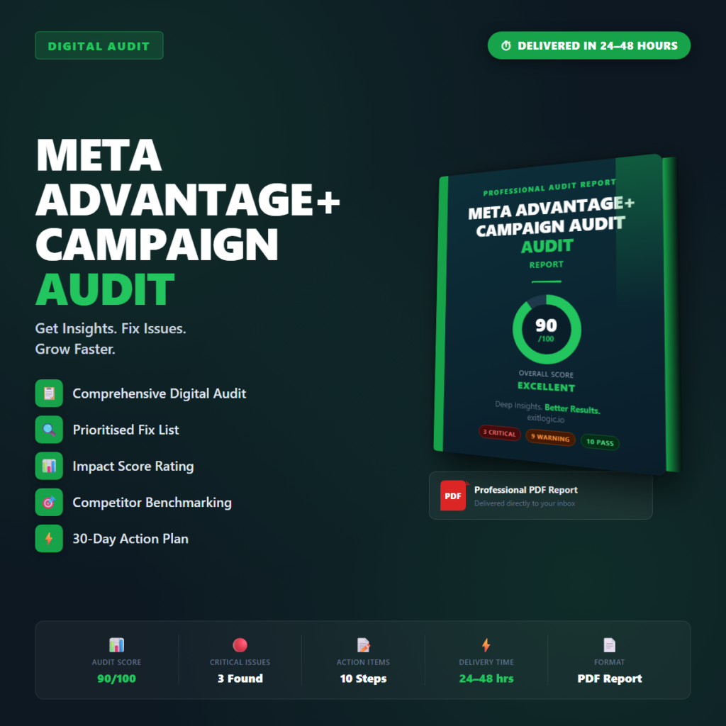 Professional PDF audit report for your Meta Advantage+ Campaign Audit. Delivered within 24โ48 hours. You provide your URLโฆ