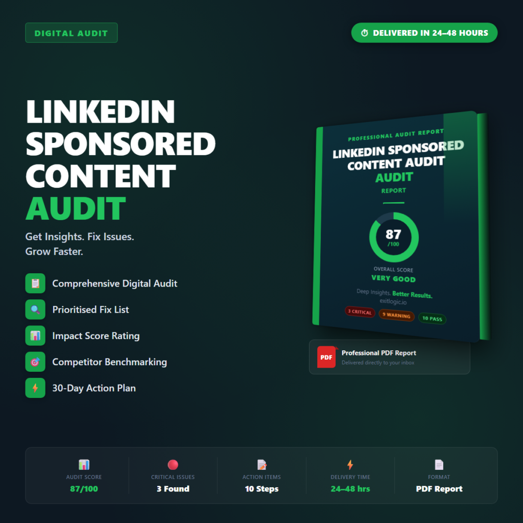 Professional PDF audit report for your LinkedIn Sponsored Content Audit. Delivered within 24โ48 hours. You provide your URLโฆ