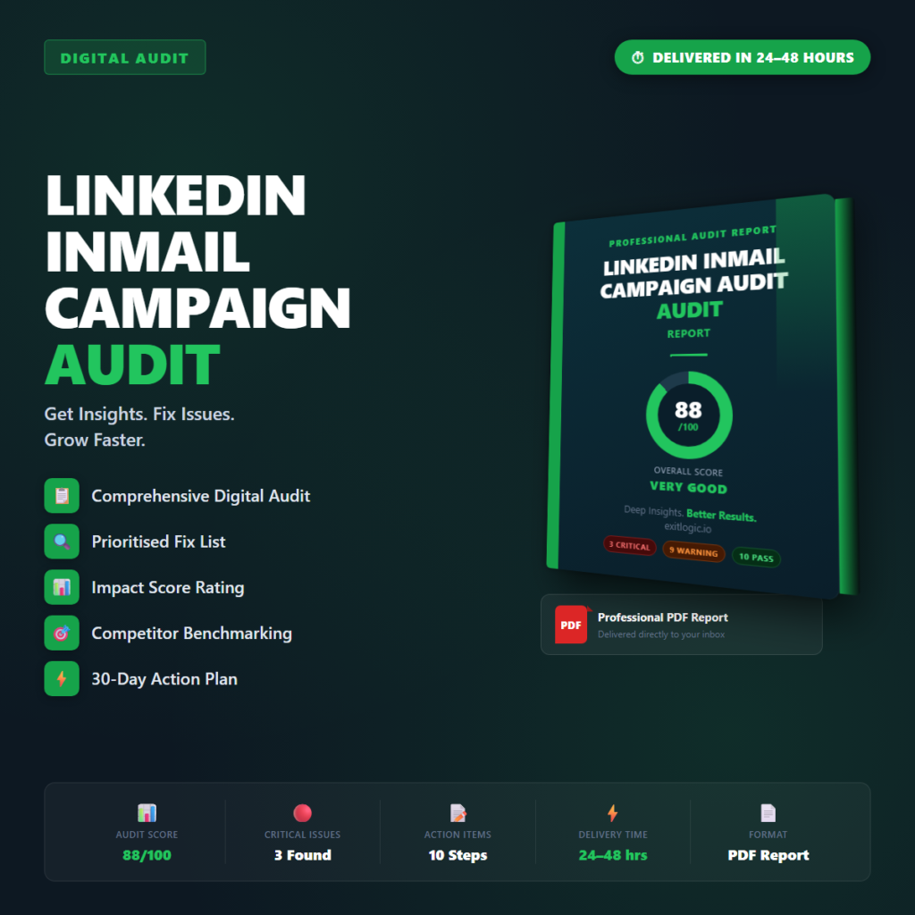 Professional PDF audit report for your LinkedIn InMail Campaign Audit. Delivered within 24โ48 hours. You provide your URLโฆ