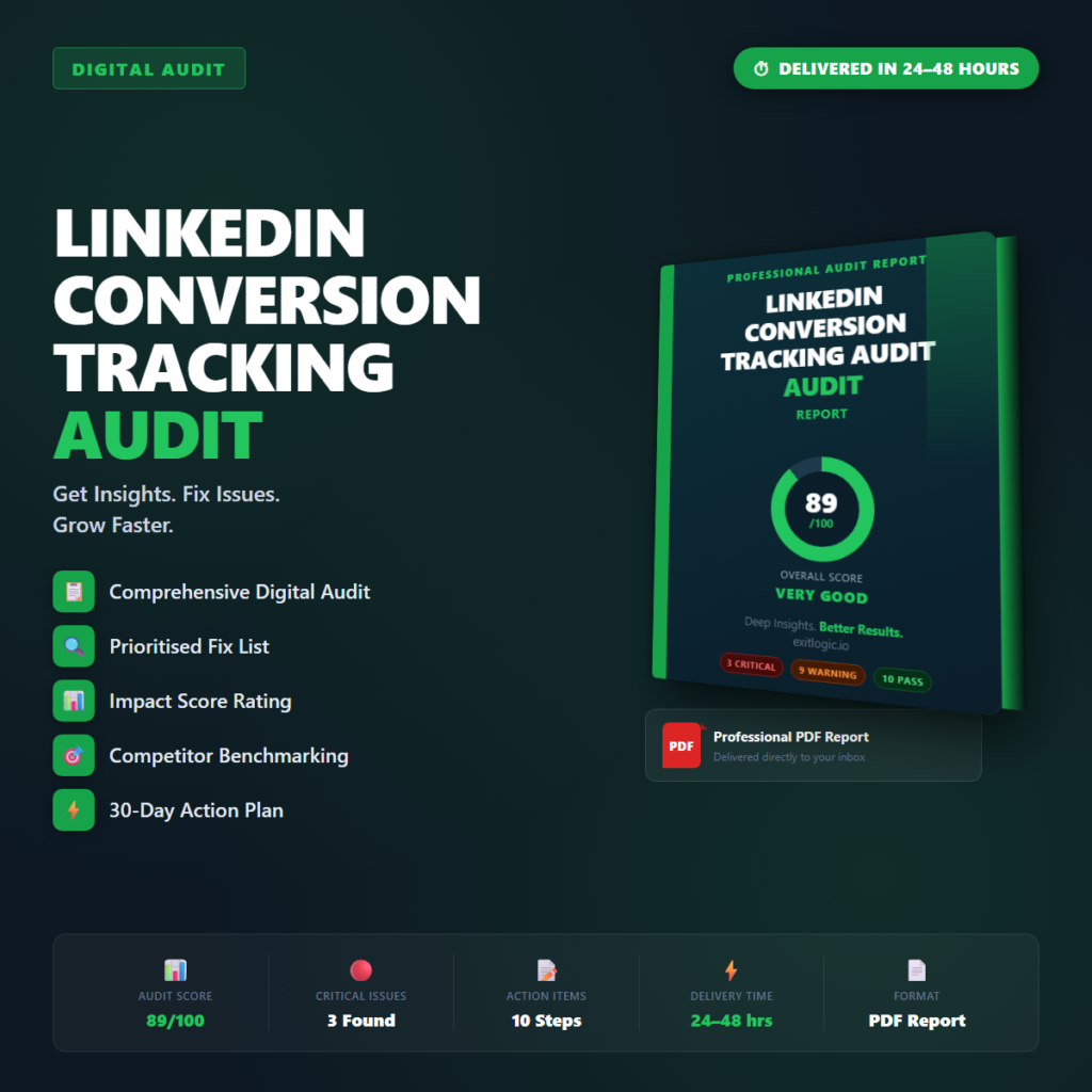 Professional PDF audit report for your LinkedIn Conversion Tracking Audit. Delivered within 24โ48 hours. You provide your URLโฆ