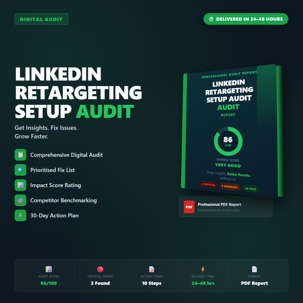 Professional PDF audit report for your LinkedIn Retargeting Setup Audit. Delivered within 24โ48 hours. You provide your URLโฆ