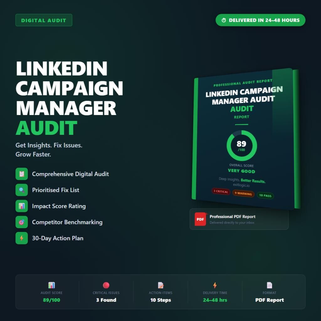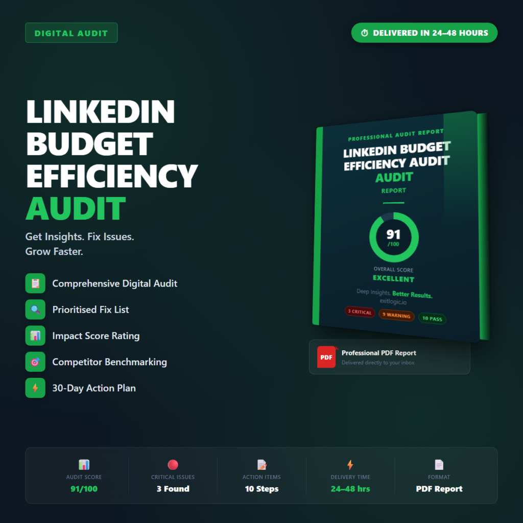 Professional PDF audit report for your LinkedIn Budget Efficiency Audit. Delivered within 24โ48 hours. You provide your URLโฆ