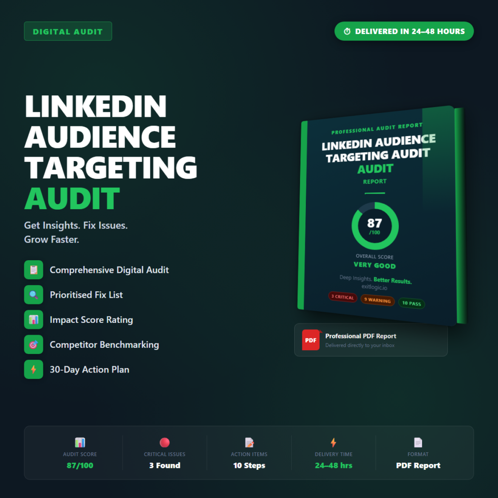 Professional PDF audit report for your LinkedIn Audience Targeting Audit. Delivered within 24โ48 hours. You provide your URLโฆ