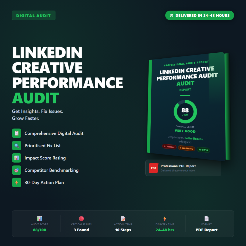 Professional PDF audit report for your LinkedIn Creative Performance Audit. Delivered within 24โ48 hours. You provide your URLโฆ