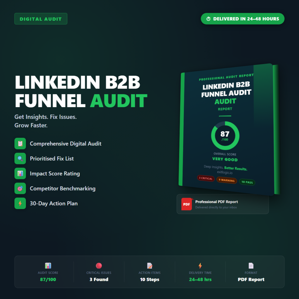 Professional PDF audit report for your LinkedIn B2B Funnel Audit. Delivered within 24โ48 hours. You provide your URLโฆ