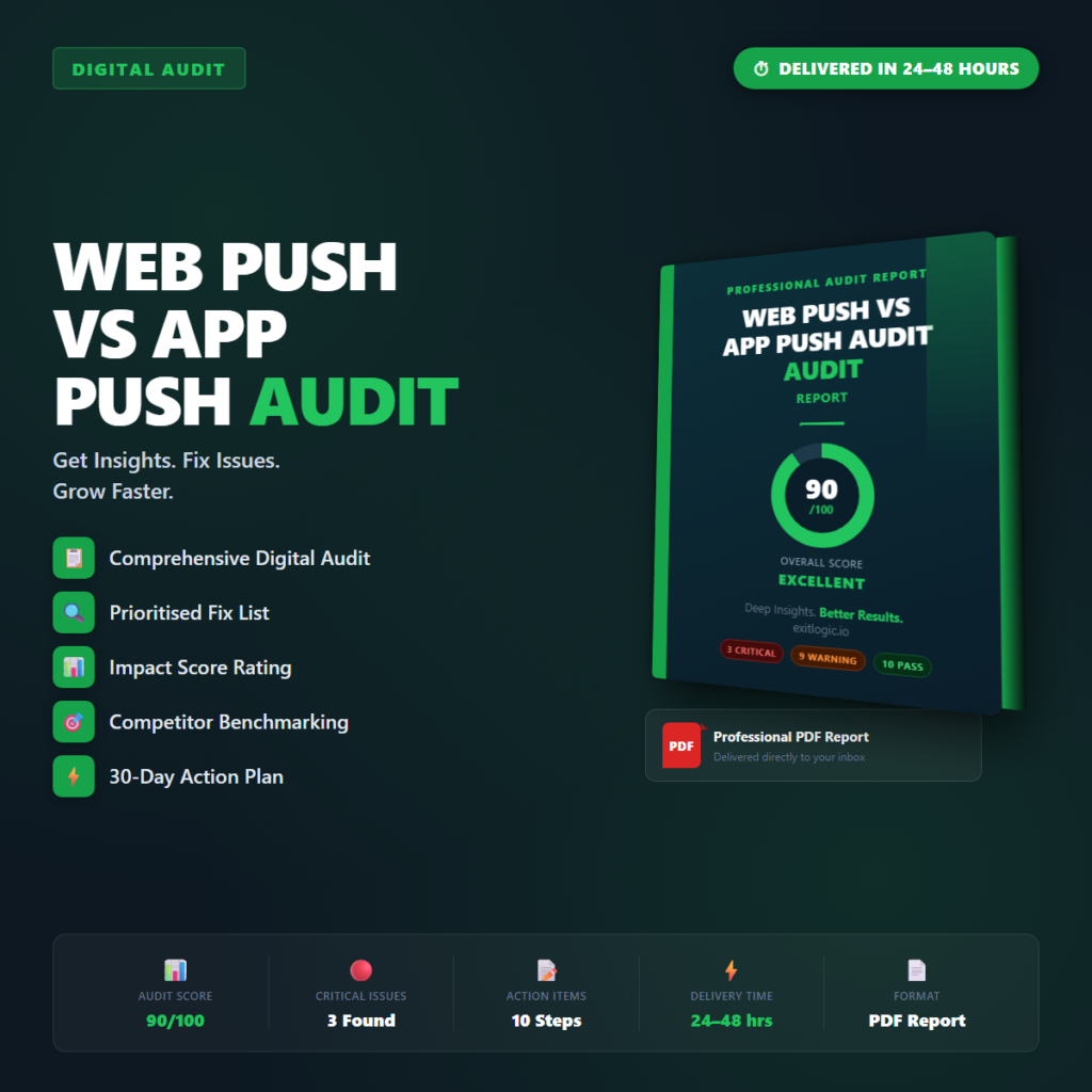 48h delivery SMS & Push Notification Audits Web Push vs App Push Audit Your Web Push vs App Push Audit surfaces the specific issues costing you revenue, users, or rankings in⦠Add to cart