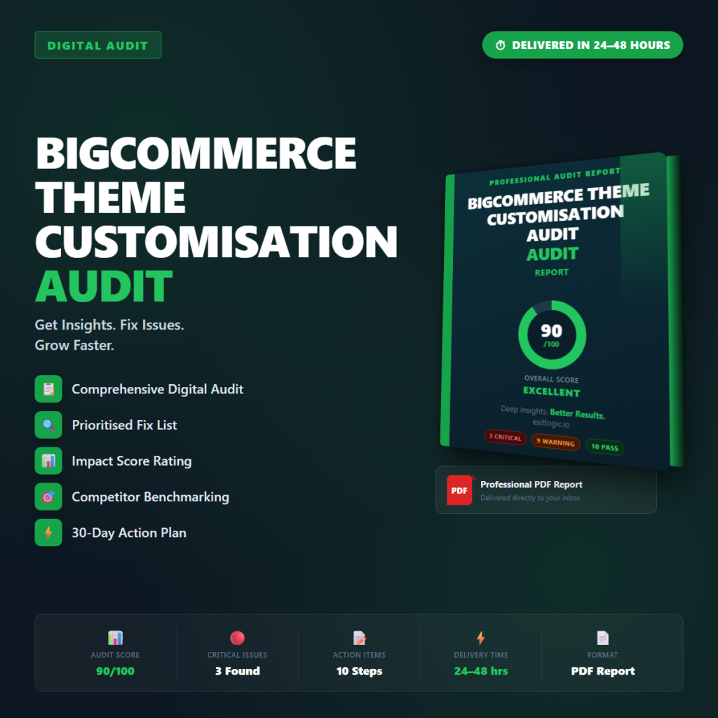 Get a professional PDF audit report for your BigCommerce Headless Commerce Readiness Audit delivered within 24–48 hours. After purchase, fill in a short intake form with your website URL and business details. Our team analyses your setup and delivers a clear, prioritised action plan — so you know exactly what to fix and in what order.
