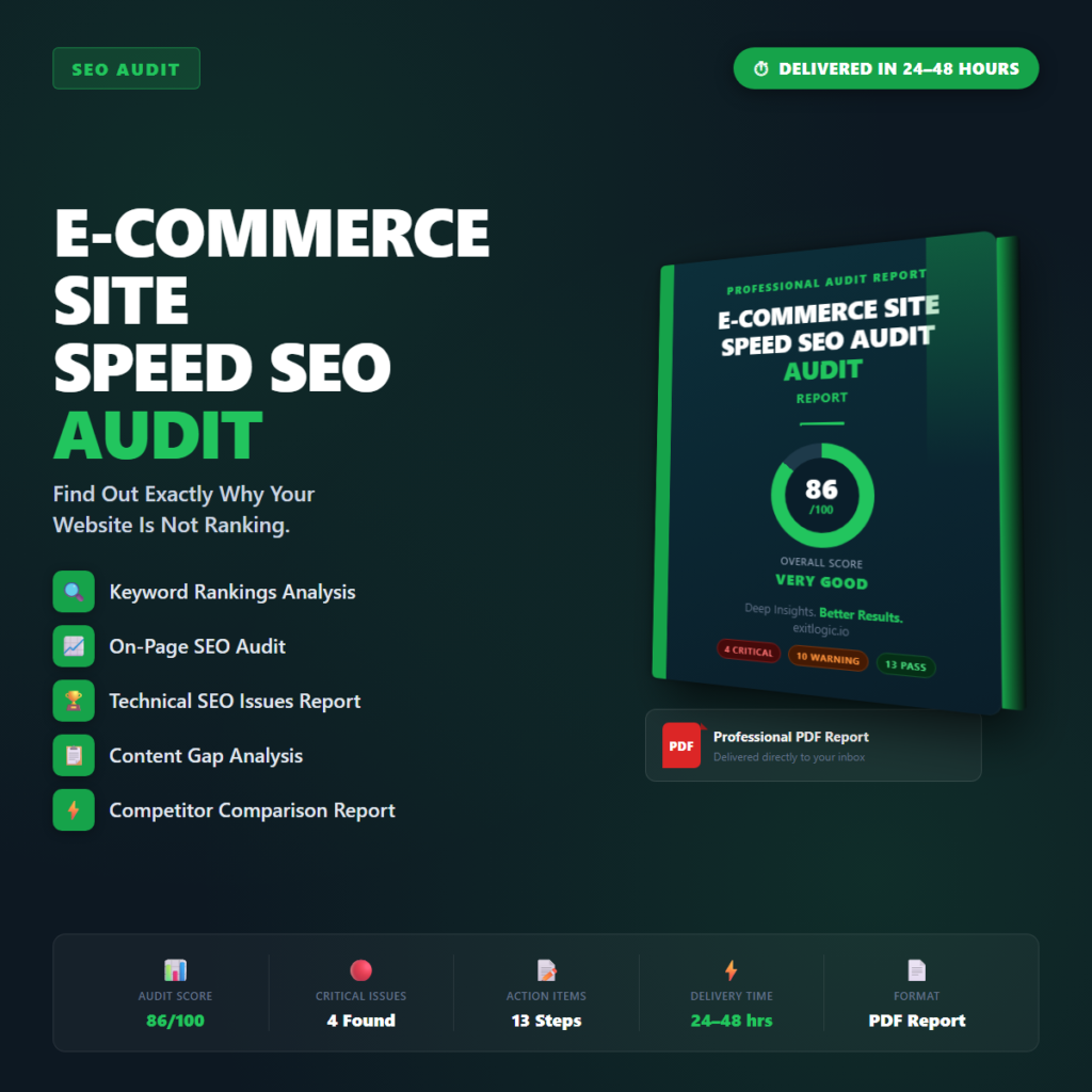 ⚠ Important — please read before purchasing: This is a diagnostic audit report delivered as a PDF document. ExitLogic provides analysis, findings, and prioritised recommendations — not a consulting service, agency retainer, or done-for-you implementation service. You or your development / marketing team are responsible for implementing the recommendations. Results will vary depending on your site, niche, and execution.