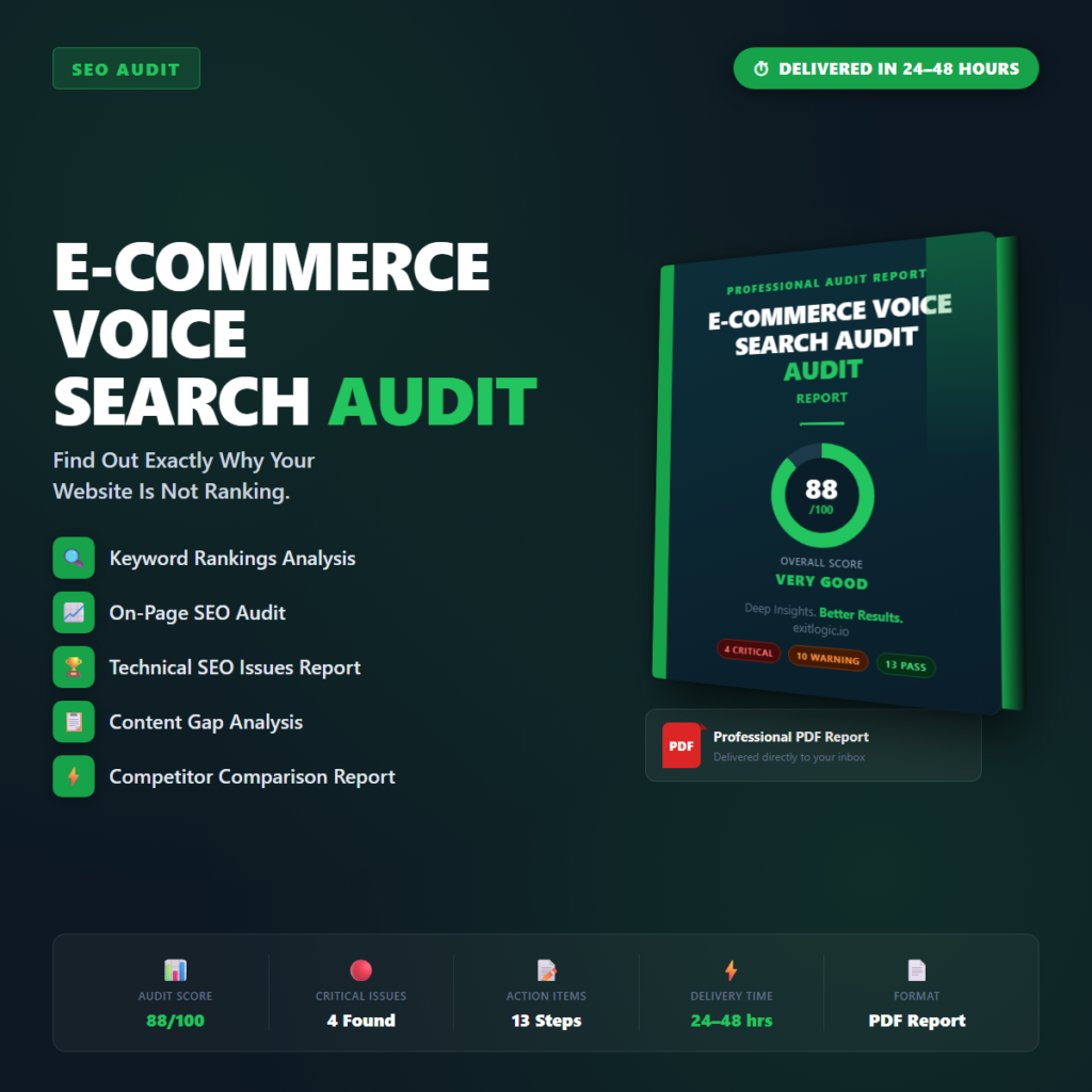⚠ Important — please read before purchasing: This is a diagnostic audit report delivered as a PDF document. ExitLogic provides analysis, findings, and prioritised recommendations — not a consulting service, agency retainer, or done-for-you implementation service. You or your development / marketing team are responsible for implementing the recommendations. Results will vary depending on your site, niche, and execution.