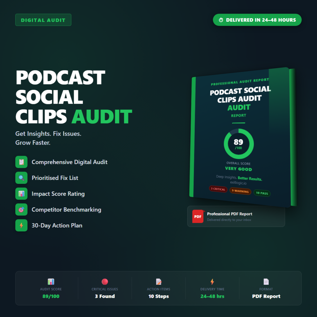 The Podcast Guest Strategy Audit is a specialist diagnostic that examines your current setup against proven best practices, identifies gaps and errors, and delivers a clear prioritised action plan. Every finding is ranked by impact so you know exactly what to fix first.