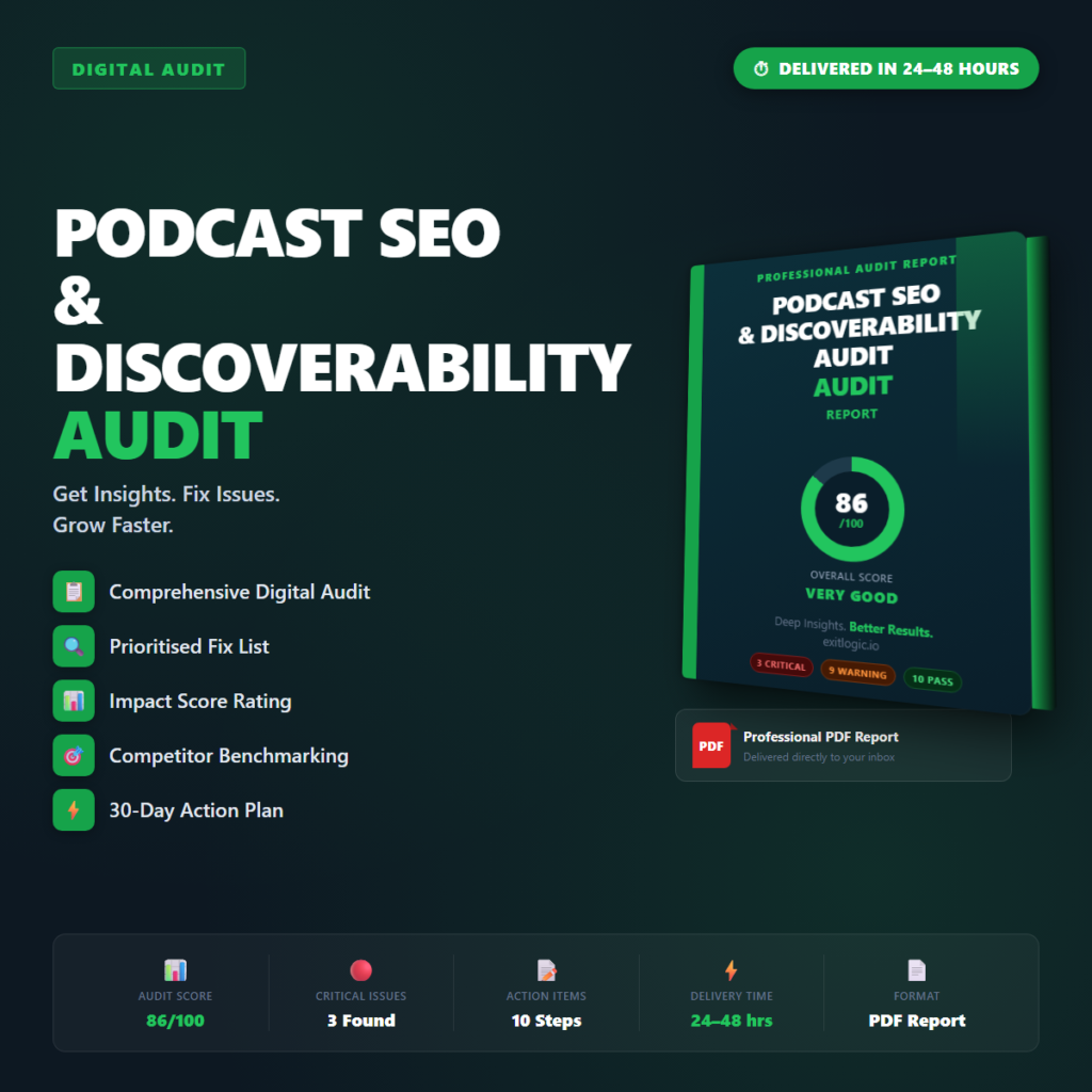 The Podcast Website Integration Audit is a specialist diagnostic that examines your current setup against proven best practices, identifies gaps and errors, and delivers a clear prioritised action plan. Every finding is ranked by impact so you know exactly what to fix first.