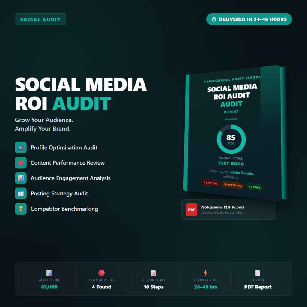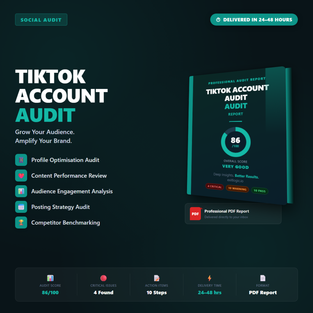 ⚠ Important — please read before purchasing: This is a diagnostic audit report delivered as a PDF document. ExitLogic provides analysis, findings, and prioritised recommendations — not a consulting service, agency retainer, or done-for-you implementation service. You or your development / marketing team are responsible for implementing the recommendations. Results will vary depending on your site, niche, and execution.